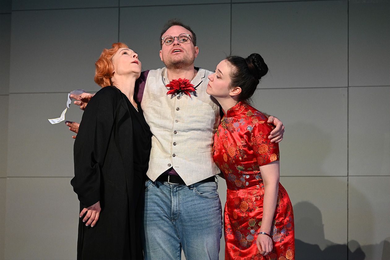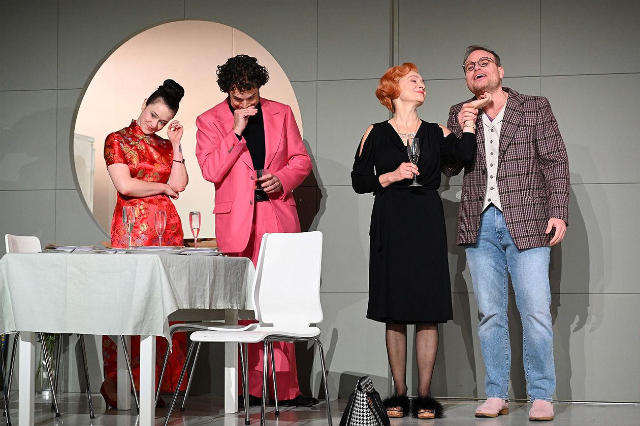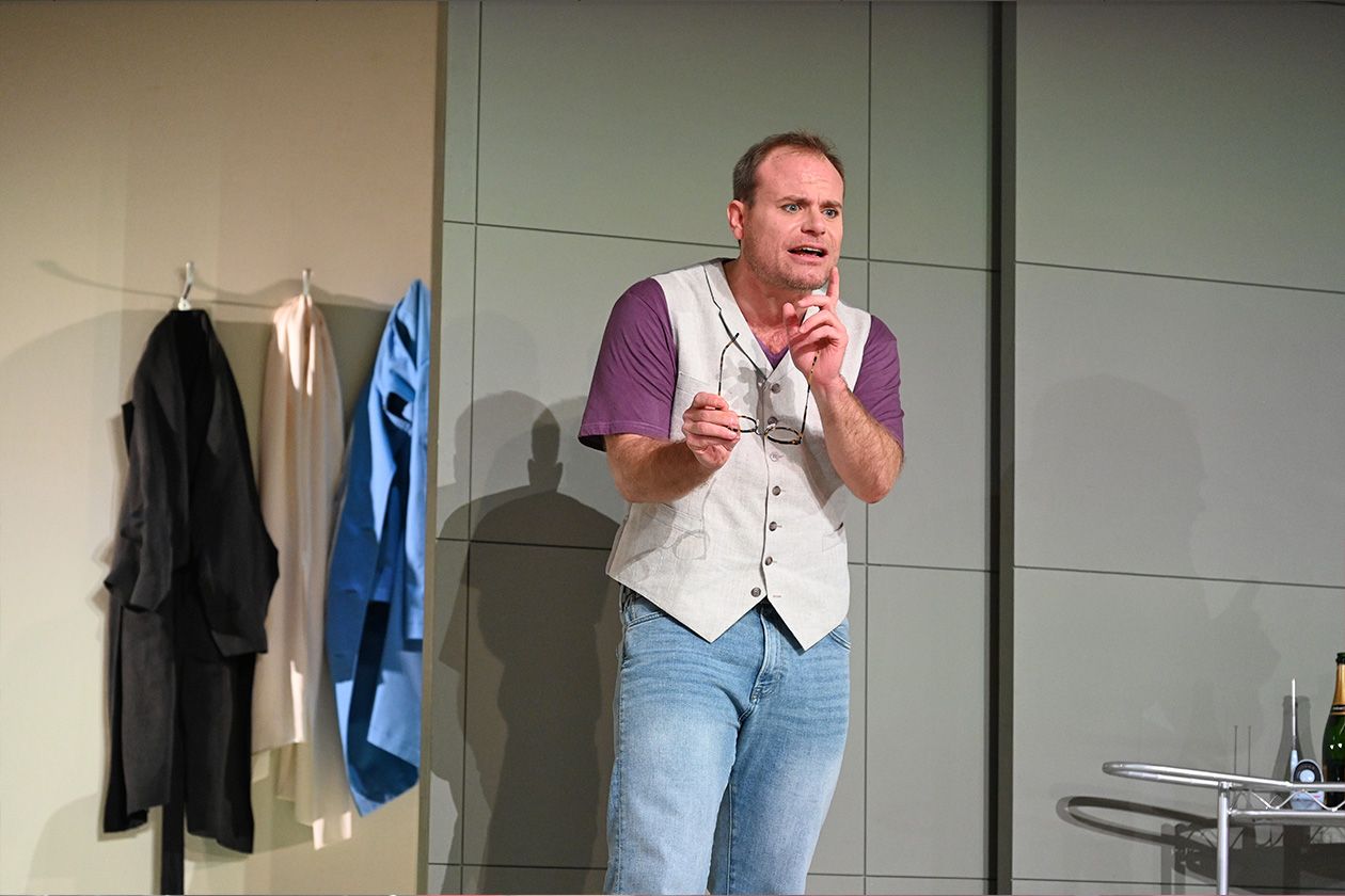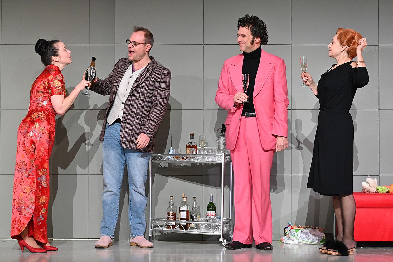 gibt den Figuren Raum für ihre verdrängten Sehnsüchte, Hoffnungen und die Nuancen ihrer Wut. Das Geschehen driftet, vom Alkohol unterstützt, konsequent ins Absurde, Böse. Bündnisse werden geschmiedet, Strategien entwickelt, um Richard noch weichzuklopfen. Das Ensemble spielt munter auf, Tobias Loth als visionärer Träumer, Romy Klötzel (erst freundliche Französischlehrerin, dann rachsüchtige Furie), Tobias D. Weber, der sich als selbstverliebter Architekt bald ganz anders offenbart, Sabine Unger als schlagfertige Witwe. [...] Und doch sind die zwei Stunden samt Pause kurzweilig und werden vom Publikum mit viel Applaus bedacht.