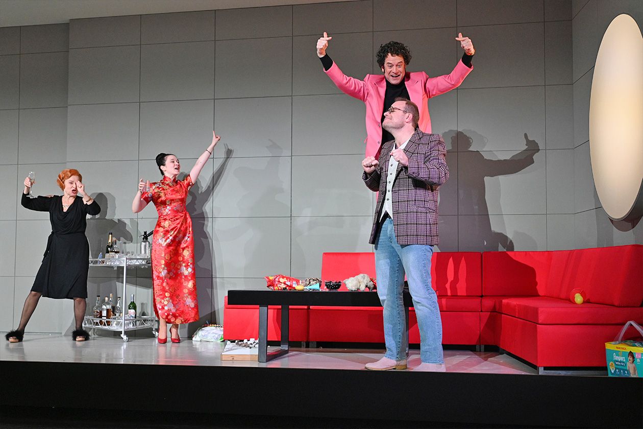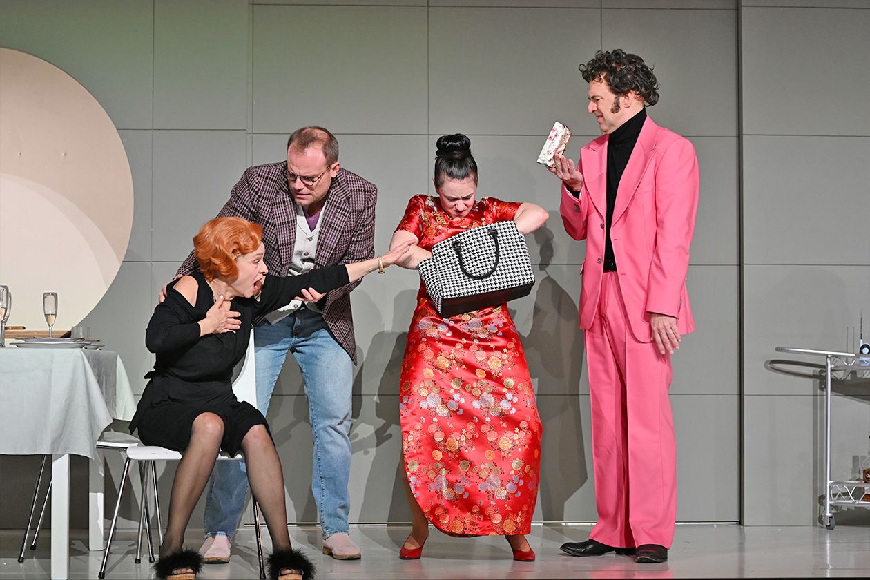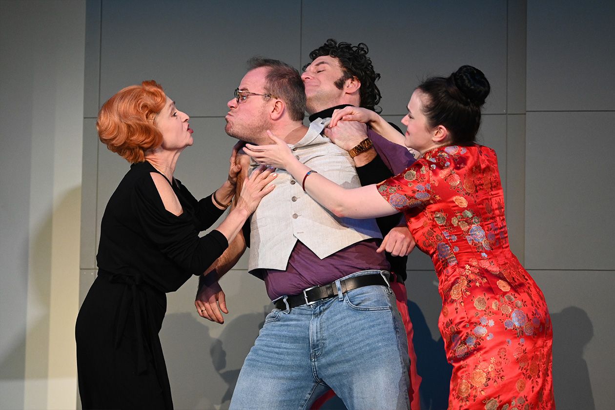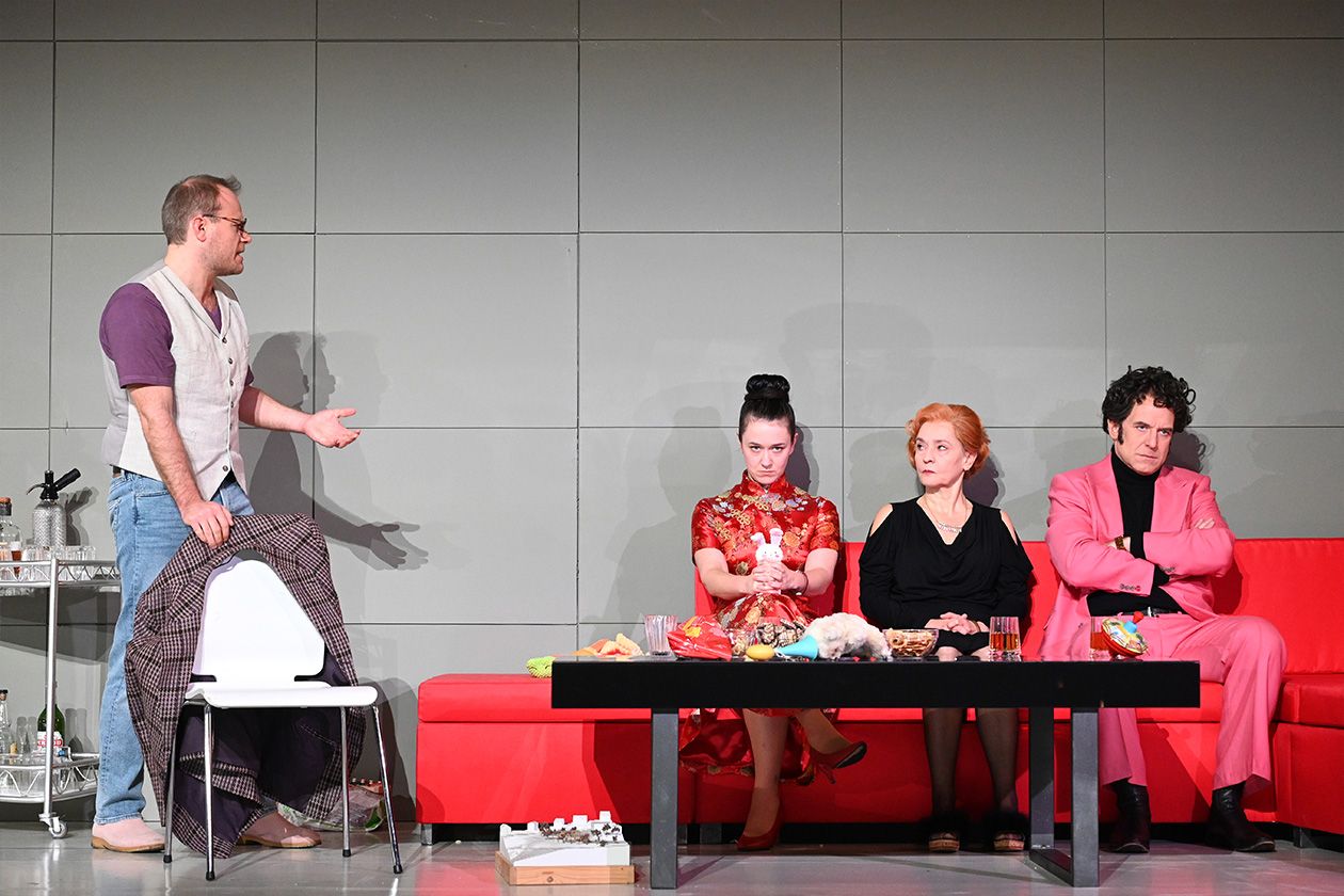 gibt den Figuren Raum für ihre verdrängten Sehnsüchte, Hoffnungen und die Nuancen ihrer Wut. Das Geschehen driftet, vom Alkohol unterstützt, konsequent ins Absurde, Böse. Bündnisse werden geschmiedet, Strategien entwickelt, um Richard noch weichzuklopfen. Das Ensemble spielt munter auf, Tobias Loth als visionärer Träumer, Romy Klötzel (erst freundliche Französischlehrerin, dann rachsüchtige Furie), Tobias D. Weber, der sich als selbstverliebter Architekt bald ganz anders offenbart, Sabine Unger als schlagfertige Witwe. [...] Und doch sind die zwei Stunden samt Pause kurzweilig und werden vom Publikum mit viel Applaus bedacht.