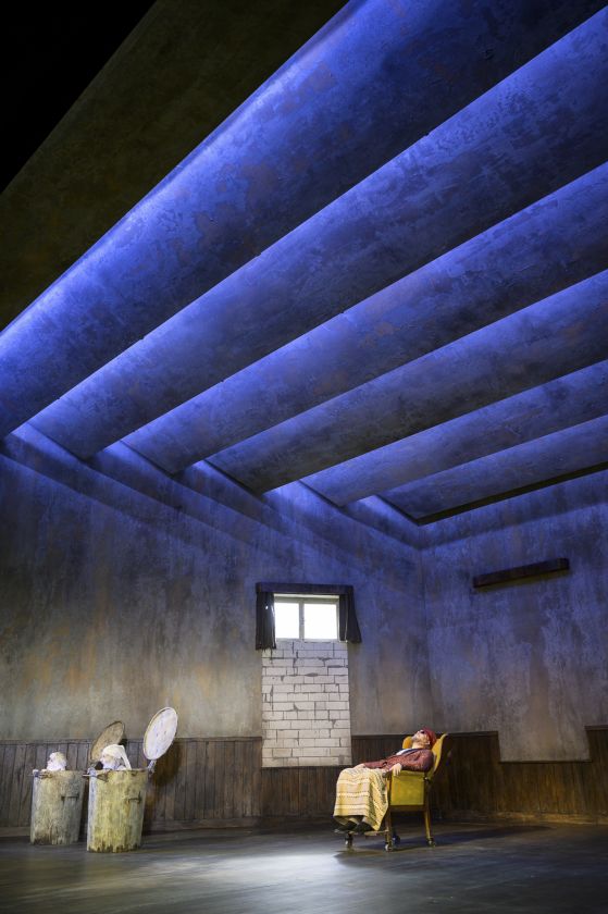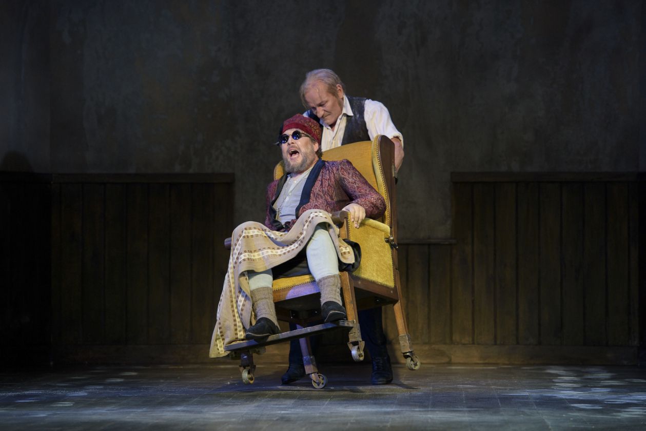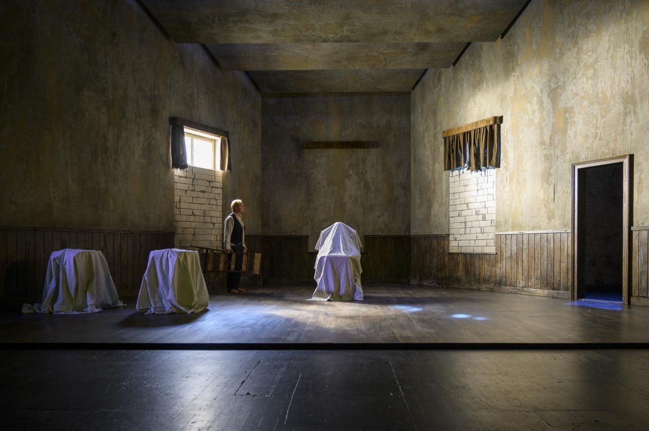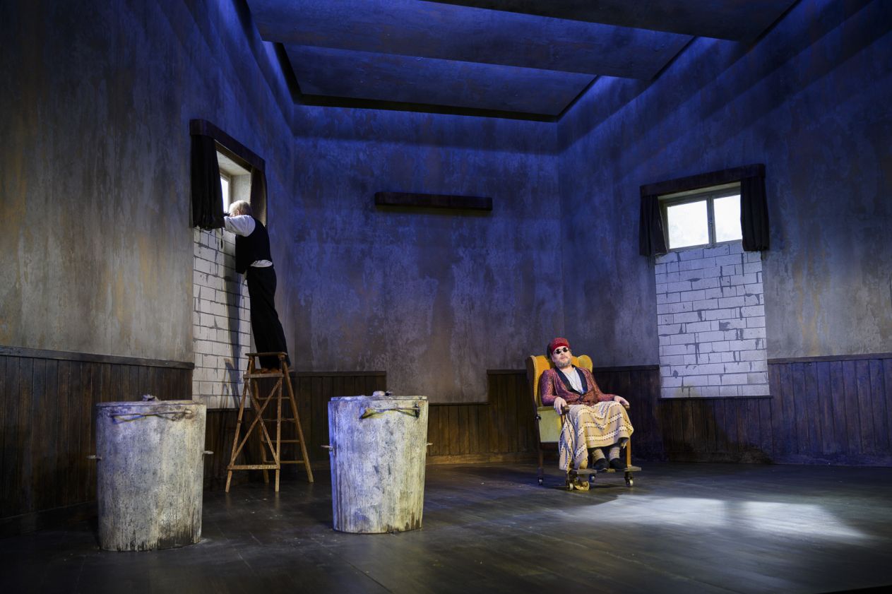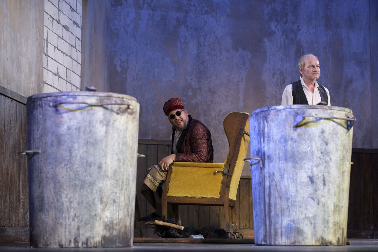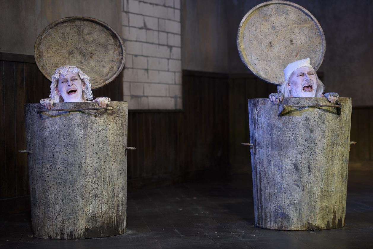 Ein Dilemma, in dem auch Hamms Eltern Nell und Nagg, die »verfluchten Erzeuger«, gefangen sind. Sie haben ihre Beine und einen Gutteil ihres Verstandes verloren, hausen neben ihrem launischen Sohn, der ihnen das karge Essen zuteilt, in Mülltonnen und träumen von der Jugend. Wenn Clov auf die Leiter steigt, um aus den Fenstern zu schauen, beschreibt er seinem blinden Herrn das Grau, das er sieht: »Es ist nichts mehr übrig.« Sie spielen das unendliche Endspiel, reden an gegen die Hoffnungslosigkeit und kämpfen mit bösem Witz gegen den eigenen Untergang.