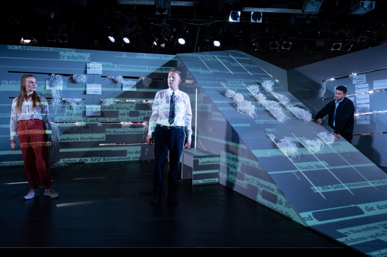 Die beiden [dura&kroesinger] haben die Bühne in einen Gerichtsaal verwandelt, in dem die Raumachsen aus dem rechten Winkel geraten sind. Aus Schlitzen in Wänden quellen geschredderte Akten hervor und die Schauspieler des Heilbronner Ensembles bewegen sich auf schiefen Ebenen. Sinnbild für die Ermittlungspannen, die Gerüchte, die ins Kraut schießen und die Stadt, die aus dem Lot geraten ist.