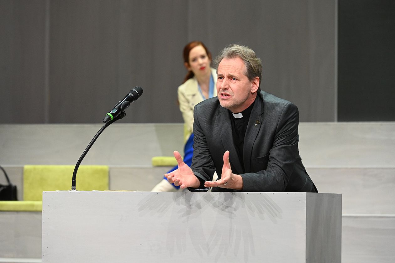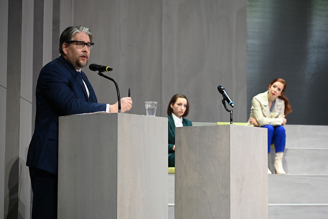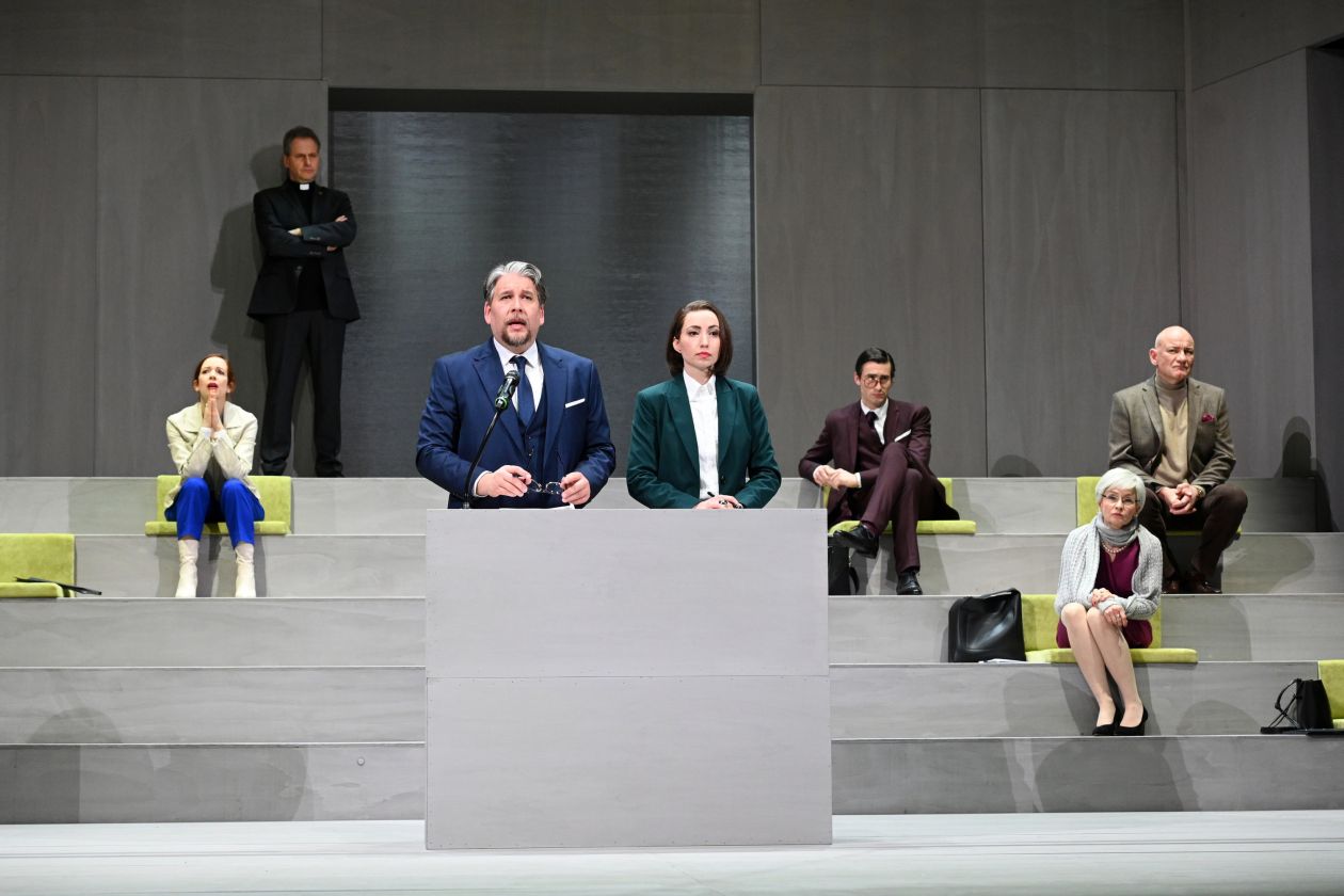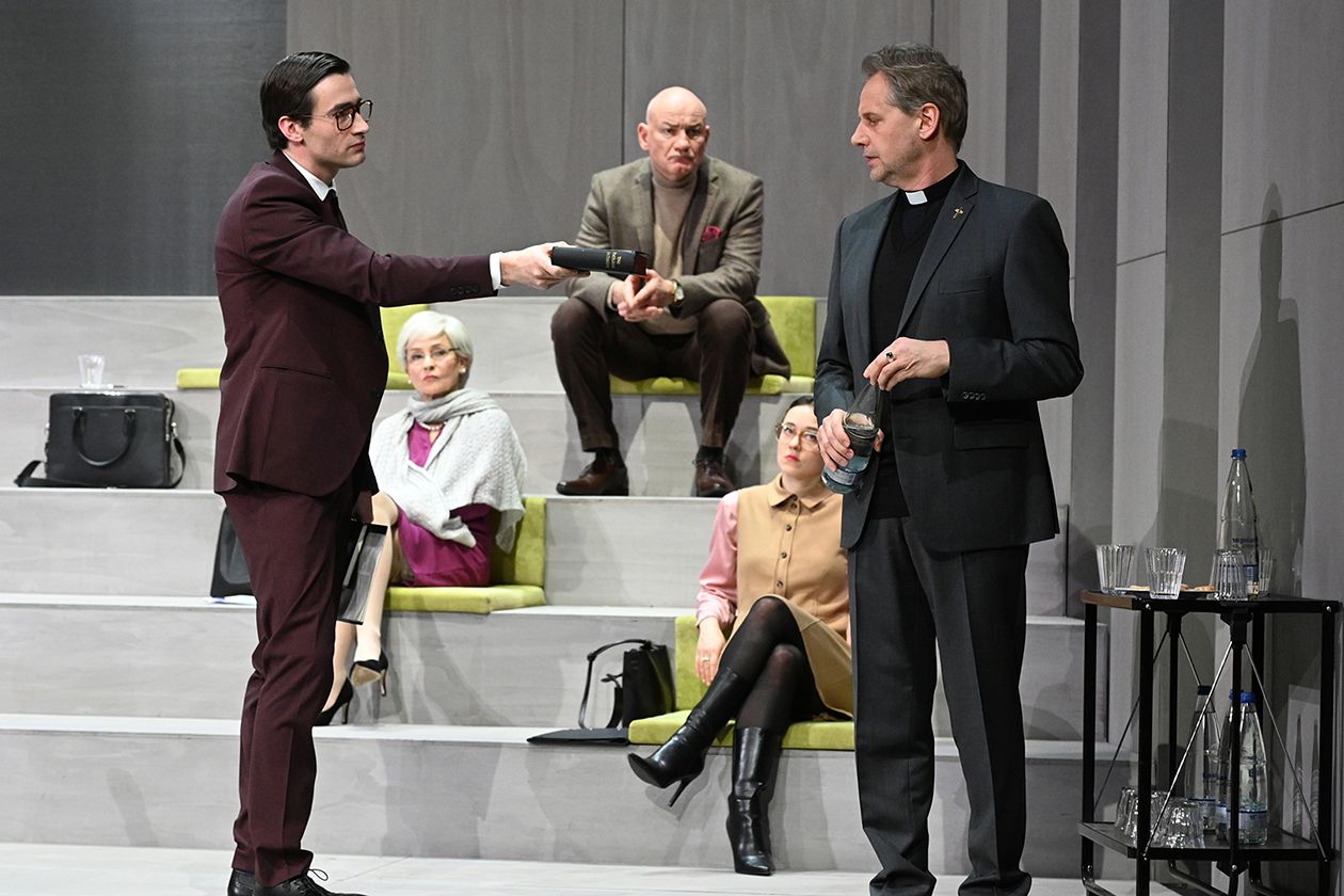 Welche Rolle spielt die historische Last, die Deutschland zu tragen hat? Wie würde sich die Gesellschaft verändern, wenn Menschen, die in schweren Lebensphasen den Todeswunsch haben, ganz einfach aus dem Leben scheiden könnten? Dürfte man einem 30-Jährigen diese Bitte abschlagen? Würde sich der Druck auf Alte und Kranke erhöhen, ihren Angehörigen nicht mehr zur Last fallen zu wollen? Wie schon in seinem ersten Stück »Terror« stellt Ferdinand von Schirach auch in »Gott« ein existentielles Thema zur Debatte. Er lässt es auf der Bühne in seiner Widersprüchlichkeit und Vielfältigkeit diskutieren und Für und Wider mit allen Konsequenzen weiterdenken. Er spiegelt damit einen aktuellen gesellschaftlichen Diskurs, der jeden einzelnen von uns betrifft: Wem gehört unser Leben? Wer entscheidet über unseren Tod? Am Ende sind die Zuschauer als Anwesende in der Debatte des Ethikrates aufgefordert, selbst nach ihren ganz persönlichen Werten zu entscheiden: Soll Richard Gärtner das tödliche Medikament bekommen? Oder nicht?