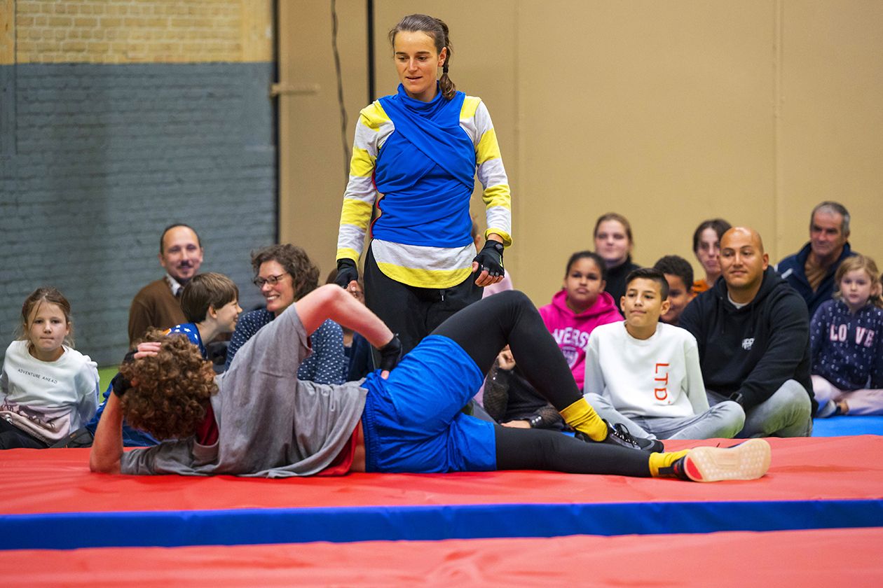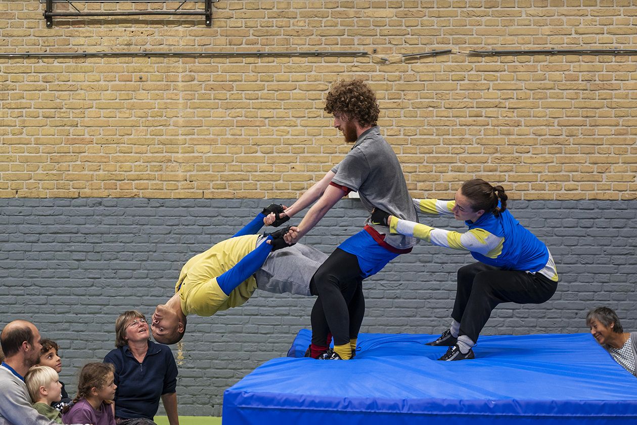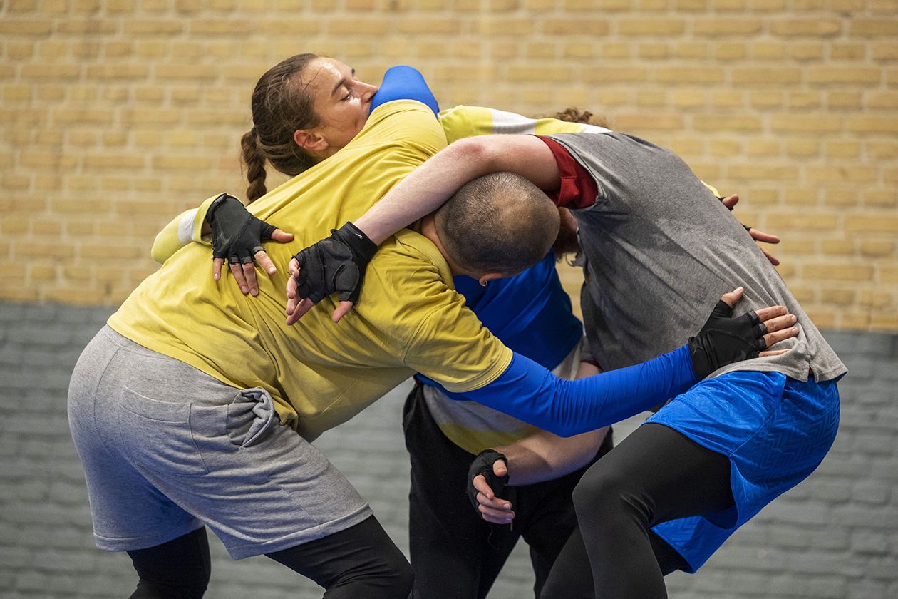 The100Hands (NL)Es ist Sport und es ist Tanz: »Matta Matta 2.0« ist eine Performance über Sicherheit und Risiko. Drei Tänzerinnen und Tänzer gehen in einer abenteuerlichen Landschaft aus Gymnastikmatten verloren und finden sich wieder. Große Weichbodenmatten sowie gezackte blaue Schaumstoffmatten, die sich zu beliebig großen Teppichböden oder Aufstellern ineinanderpuzzeln lassen, werden zum raffinierten Bühnenbild des Tanzstückes. Manchmal bilden sie einen Schutzraum, ein anderes Mal versperren sie die Sicht und schaffen spannungsgeladene Situationen.